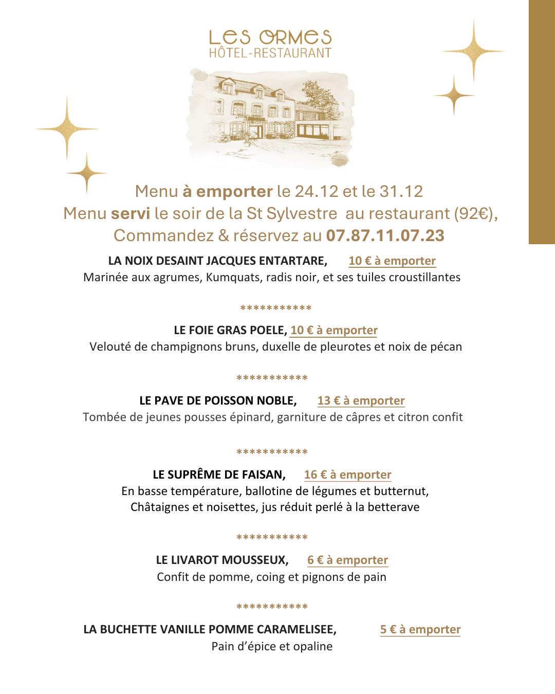 Menu à emporter le 24.12 et le 31.12 Menu servi le soir de la St Sylvestre (92€) au restaurant, Commandez & réservez au 07.87.11.07.23 (1)